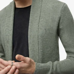 - Open front, long sleeves, all-over fine ribbed knit, Ramskull embroidery at chest, slim fit