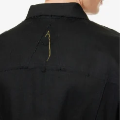- Boxy fit, spread collar, long sleeves, buttoned cuffs, two faux flap pockets at chest, two slip pockets at sides, embroidered branding at back, distressed finish