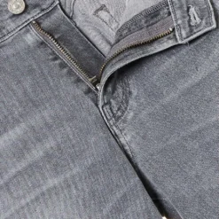 - Slim fit, mid-rise, tapered leg, belt loops, five pockets, brand patch at back, branded hardware