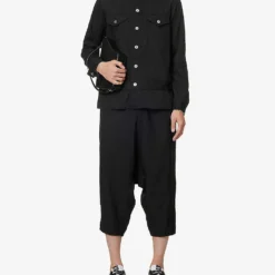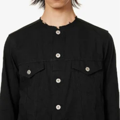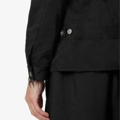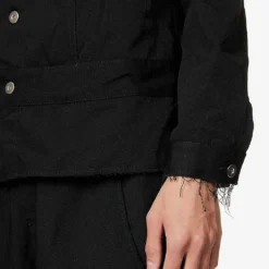 - Regular fit, crew neck, long sleeves, buttoned cuffs, two buttoned pockets and two slip pockets at front, buttoned epaulettes at back, raw trims, straight hem