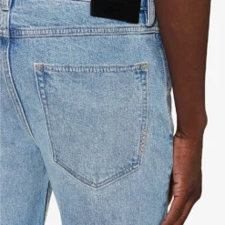 - Slim fit, mid-rise, tapered leg, belt loops, five pockets, brand patch at back, branded hardware, faded wash, partially lined