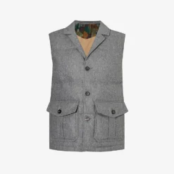 - Regular fit, notched lapels, sleeveless, two buttoned flap pockets at front, quilted padding, fully lined