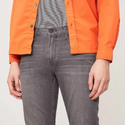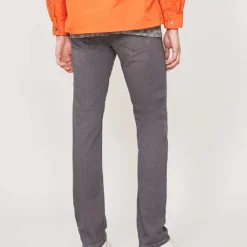 - Slim-straight fit, tapered leg, mid-rise, subtle faded wash and whiskering, contrast stitching, belt loops, five pockets, branded hardware, branded leather patch at back waistband, V-shaped yoke at back, brand signature stitching detail at back pocket