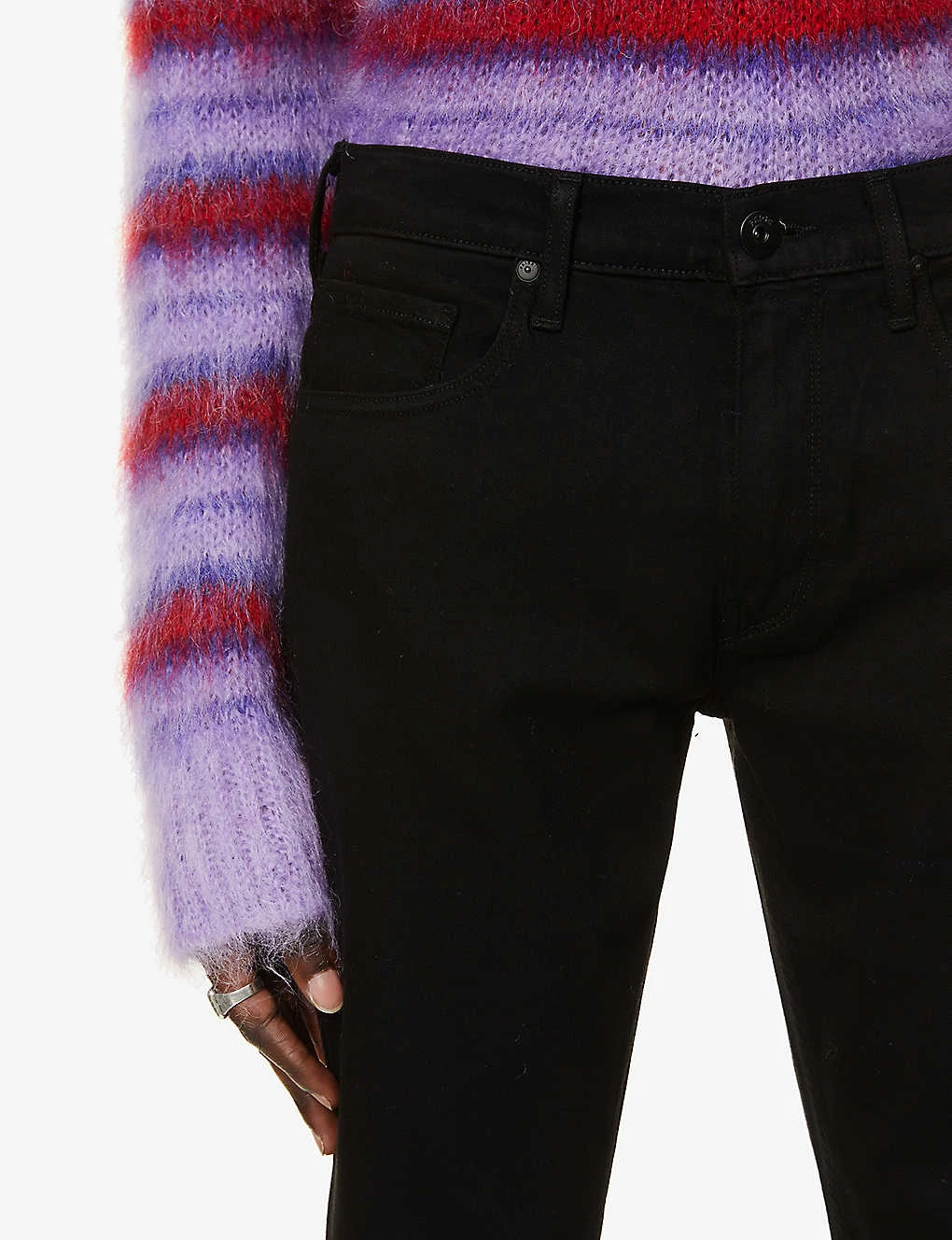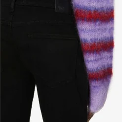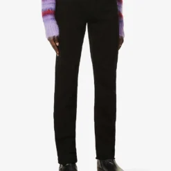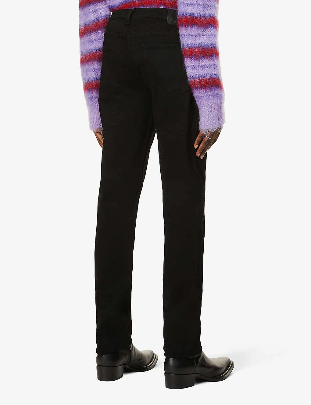 - Slim-straight fit, tapered leg, mid-rise, belt loops, five pockets, branded hardware, branded leather patch at back waistband, v-shaped yoke at back, brand signature stitching detail at back pocket