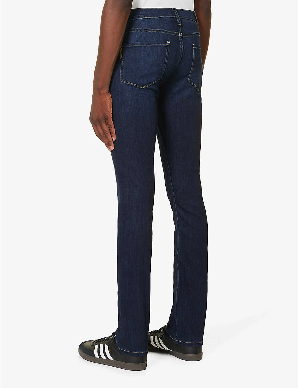 - Slim fit, mid-rise, straight leg, belt loops, five pockets, contrast stitching, brand patch at back, branded hardware, partially lined