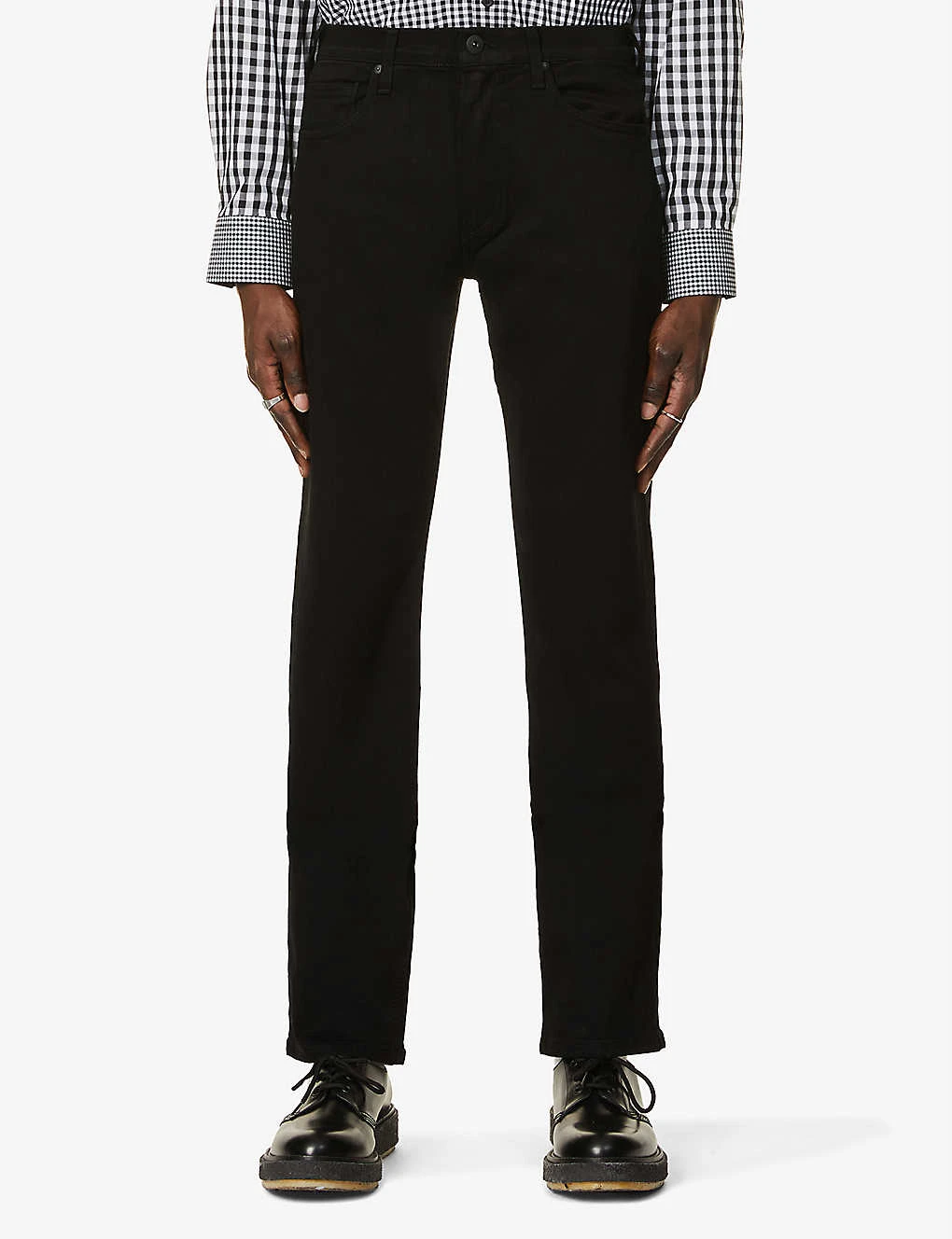 - Straight fit, mid rise, tapered leg, belt loops, five pockets, metal hardware, subtle faded wash, branded leather patch at back waistband, V-shaped yoke at back