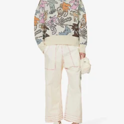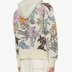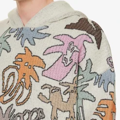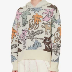 - Boxy fit, hood, dropped shoulders, long sleeves, medium knit, all-over contrast graphic pattern, brand patch at side, ribbed trims