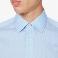 - Regular fit, long sleeves, pleated cuffs, pearlescent buttons, pleated yoke, all-over striped pattern, curved hem