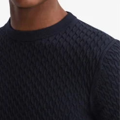 - Regular fit, crewneck, long sleeves, all-over cable knit design, ribbed trims