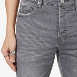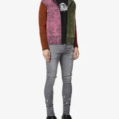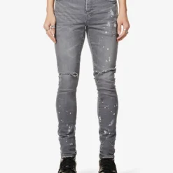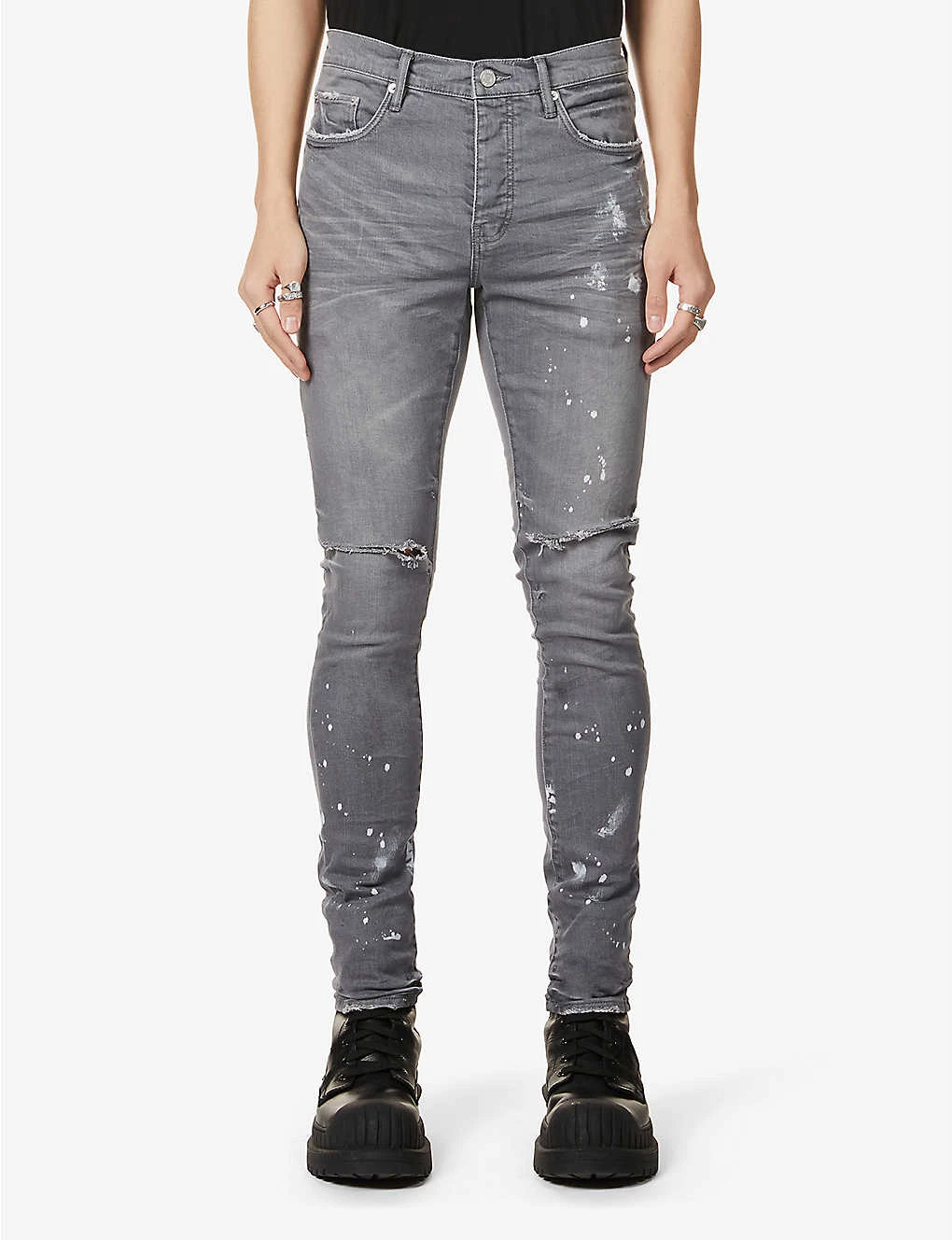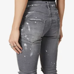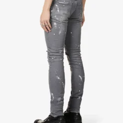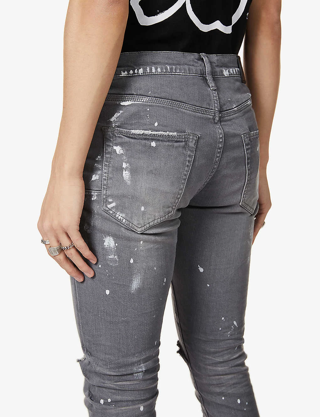 - Slim fit, mid-rise, skinny leg, belt loops, five pockets, faded wash and whiskering, all-over paint splash pattern, ripped at knees, crinkled texture, branded patch at back waistband, v-shaped yoke at back