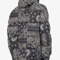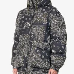 - Relaxed fit, funnel neck, toggle hood, long sleeves, adjustable elasticated cuffs, two flap pockets at front, quilted padding, toggle hem, all-over branded paisley pattern, two slip pockets at interior, fully lined