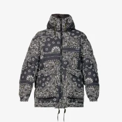 - Relaxed fit, funnel neck, toggle hood, long sleeves, adjustable elasticated cuffs, two flap pockets at front, quilted padding, toggle hem, all-over branded paisley pattern, two slip pockets at interior, fully lined