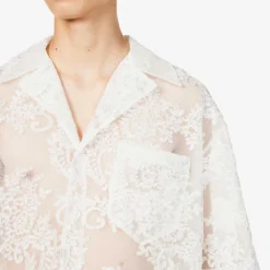 - Boxy fit, short sleeves, semi-sheer, patch pocket at chest, pearlescent buttons, all-over floral lace, scalloped trims