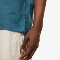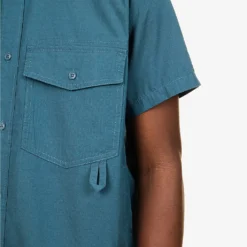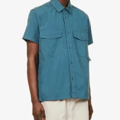 - Regular fit, short sleeves, two buttoned flap pockets at chest, two slip pockets at sides, embroidered branding at front, pleated yoke, stepped hem